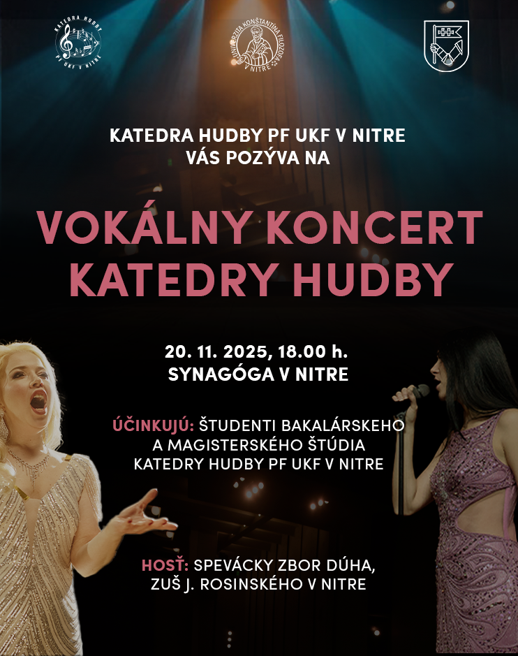 Katedra hudby Pedagogickej fakulty UKF v Nitre srdečne pozýva na vokálny koncert, ktorý sa uskutoční 20. novembra 2025 o 18.00 hod. v Synagóge v Nitre.